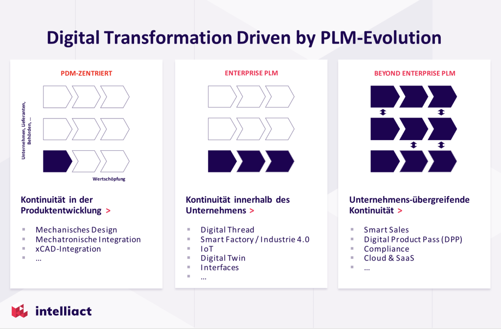Product Lifecycle Management (PLM) is continuously penetrating companies. Starting from its original user group, product development, other user groups along the value chain are becoming involved. We distinguish between three basic stages, which are characterized by their focus on different user groups.